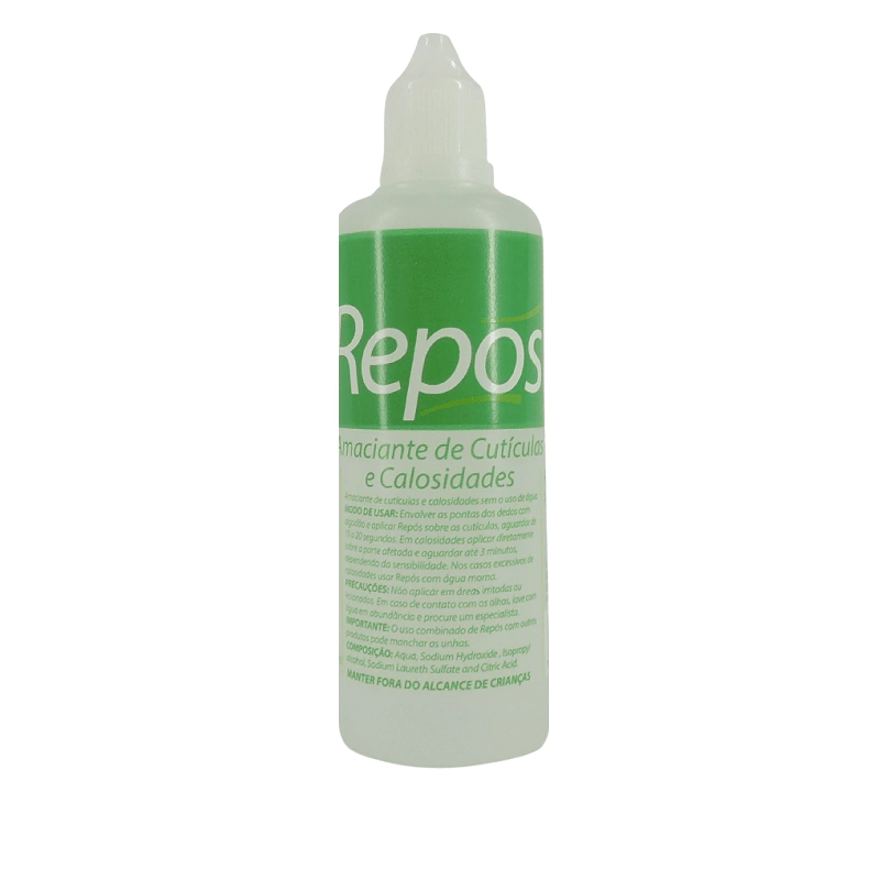 O Amaciante De Cutículas e Calosidade Repos é indicado para o amolecimento de cutículas e calosidades. Não deve ser aplicado sobre áreas irritadas e/ou lesionadas. O uso combinado de Repos com outros produtos pode manchar as unhas