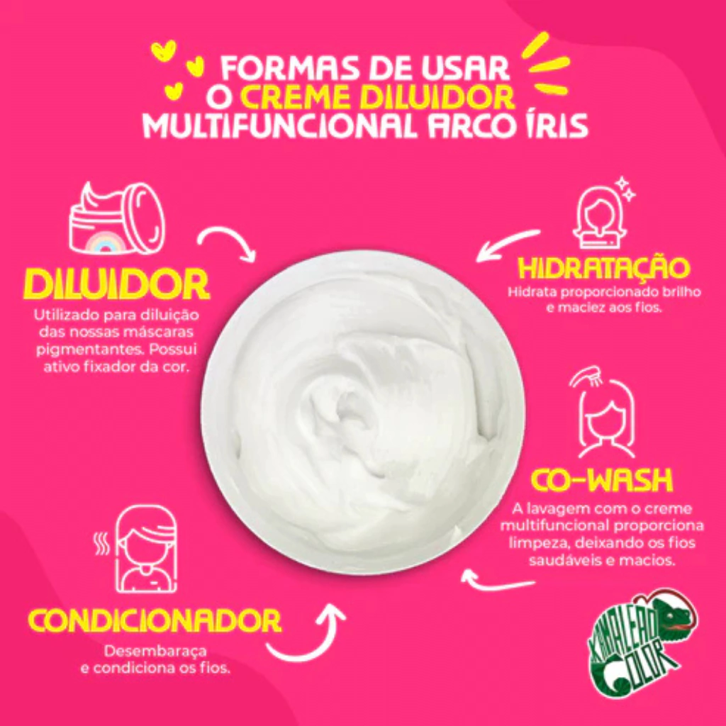 O Diluidor Arco Íris é um creme multifuncional desenvolvido para potencializar o efeito da coloração. Possibilita maior versatilidade na formação de cores, tornando possível a criação de tons pastéis. Sua fórmula possui ingredientes que proporcionam maciez, sedosidade e hidratação. Possui as seguintes funções: