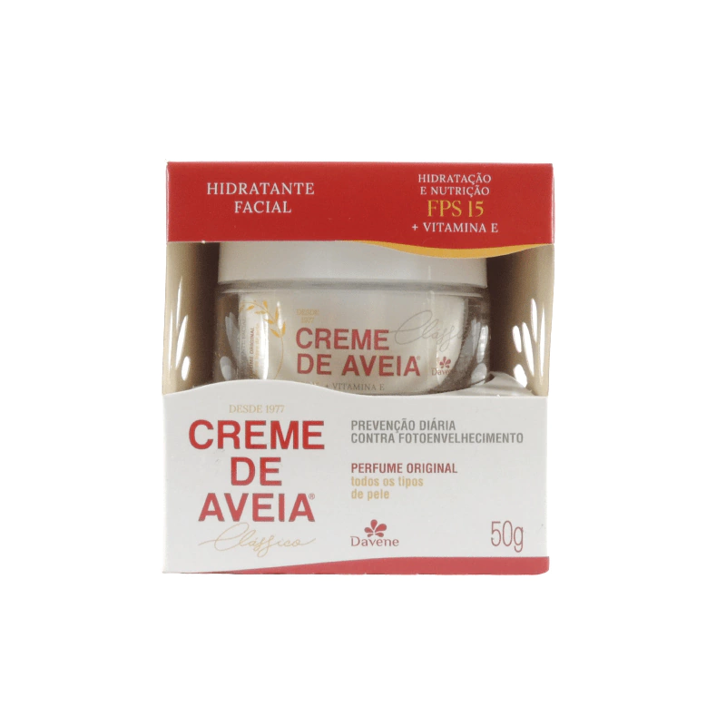 Pensando nisso, a Davene trouxe uma opção acessível e o melhor, com proteção solar! A linha de Hidratante Facial Creme de Aveia na versão perfume original deixa a pele do rosto hidratada na medida certa, sem obstruir os poros ou deixá-la oleosa. Sua fórmula contém FPS 15, que protege contra os efeitos nocivos do sol, uma das causas do envelhecimento precoce da pele, como resultado você conquista uma pele saúdavel, hidratada, nutrida e protegida.
