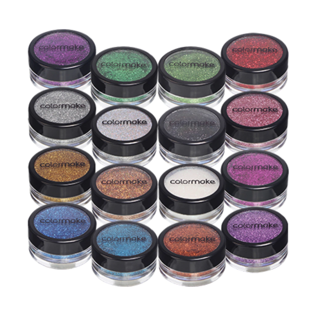 Embalagens individuais de 4g, disponíveis em 16 cores: Azul, Azul Claro, Cobre, Ouro, Ouro Holográfico, Lilás, Pérola, Pink, Prata, Prata Holográfico, Preto, Rosa, Roxo, Verde, Verde Claro e Vermelho.